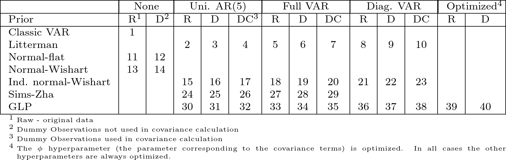 Across all the experiments it is difficult to give an overall winner. The original Litterman and GLP priors are ahead of the others, but knowing which covariance choice to select or whether to include dummy observations is more ambiguous.