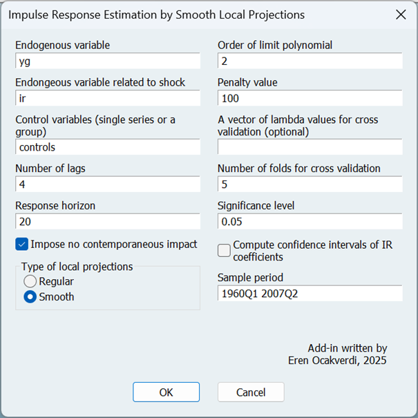 Proposed methodology is applied to study the effects of monetary shocks on output. Therefore, it is assumed that the response of GDP growth to a monetary shock can be identified by introducing a shock to Fed funds rate. Here, contemporaneous values of GDP growth and inflation as well as four lags of GDP growth, inflation, and the Fed funds rate are used as control variables. To run the procedure on this data, we can use the add-in (see Figure 2).
