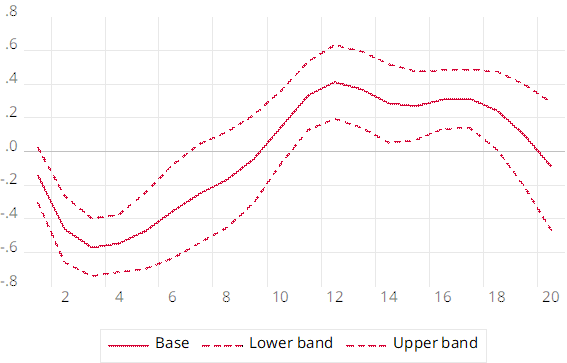 Figure 4 plots the coefficients of impulse response estimation of smooth LP along with 95% confidence intervals. Lambda parameter is also determined by running 5-fold cross-validation on alternative values (i.e. 1, 10, 50, 100, 250, 500, 1000, 5000, 10000).